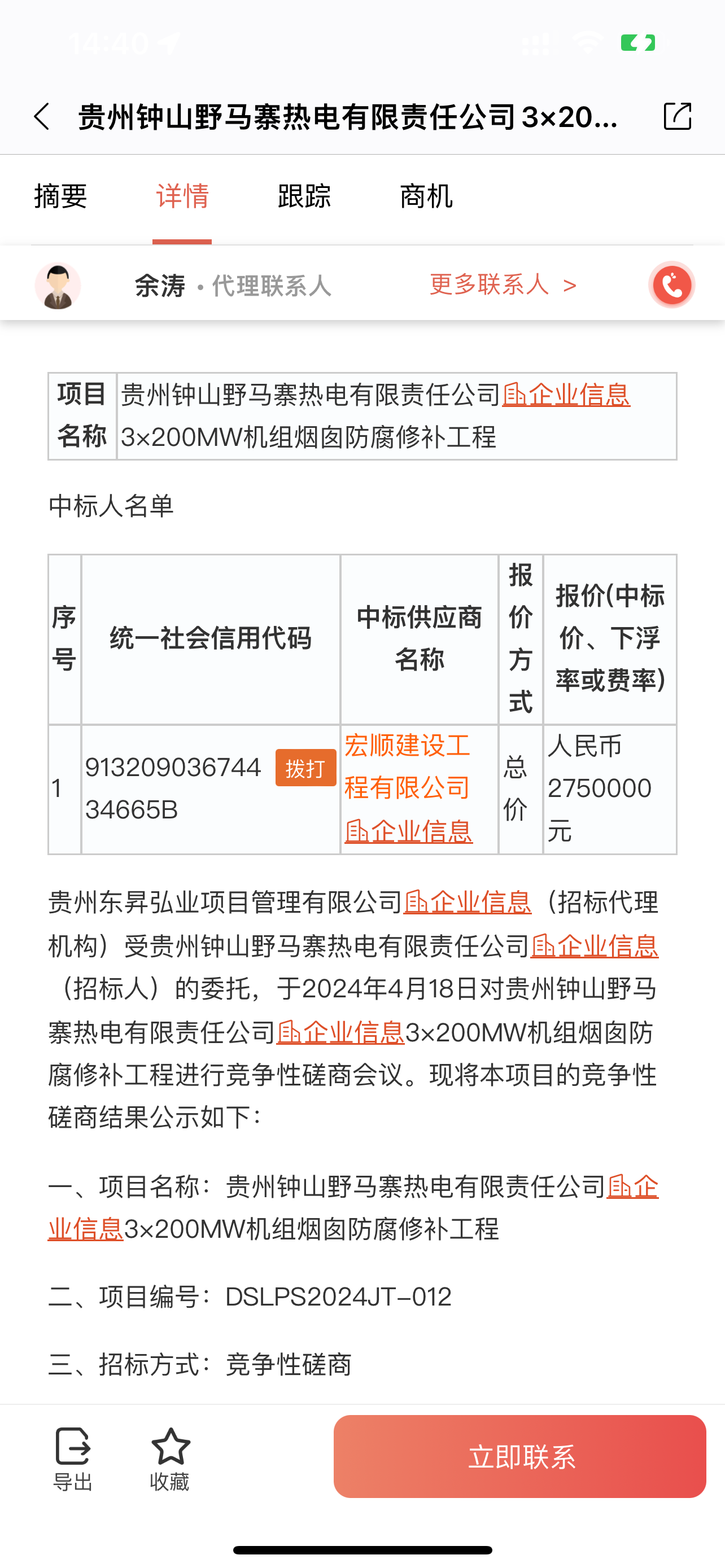 熱烈祝賀我公司中標貴州鐘山野馬寨熱電煙囪防腐修補工程項目